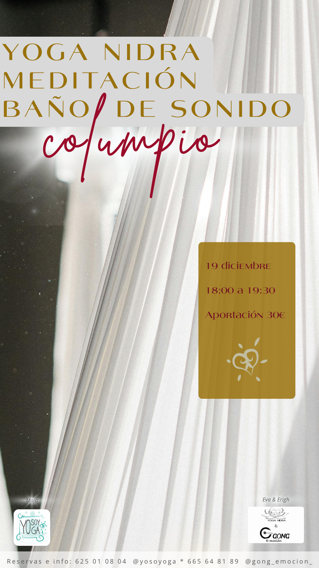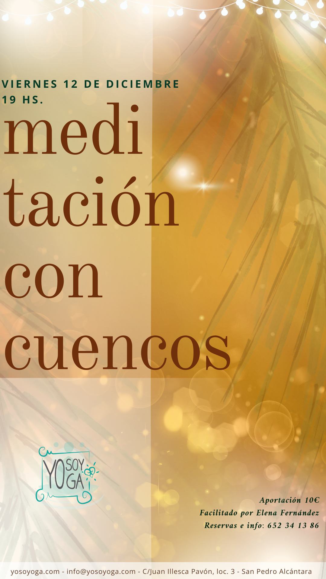 La primer clase la puedes reservar por WhatsApp (625 01 08 04) o email (info@yosoyoga.com). Al terminar la clase, decides si quieres abonar la clase suelta (15€) o si prefieres comprar un Bono. En ese caso, descontamos la 1º clase directamente de él y empezará a correr el tiempo desde ese día.