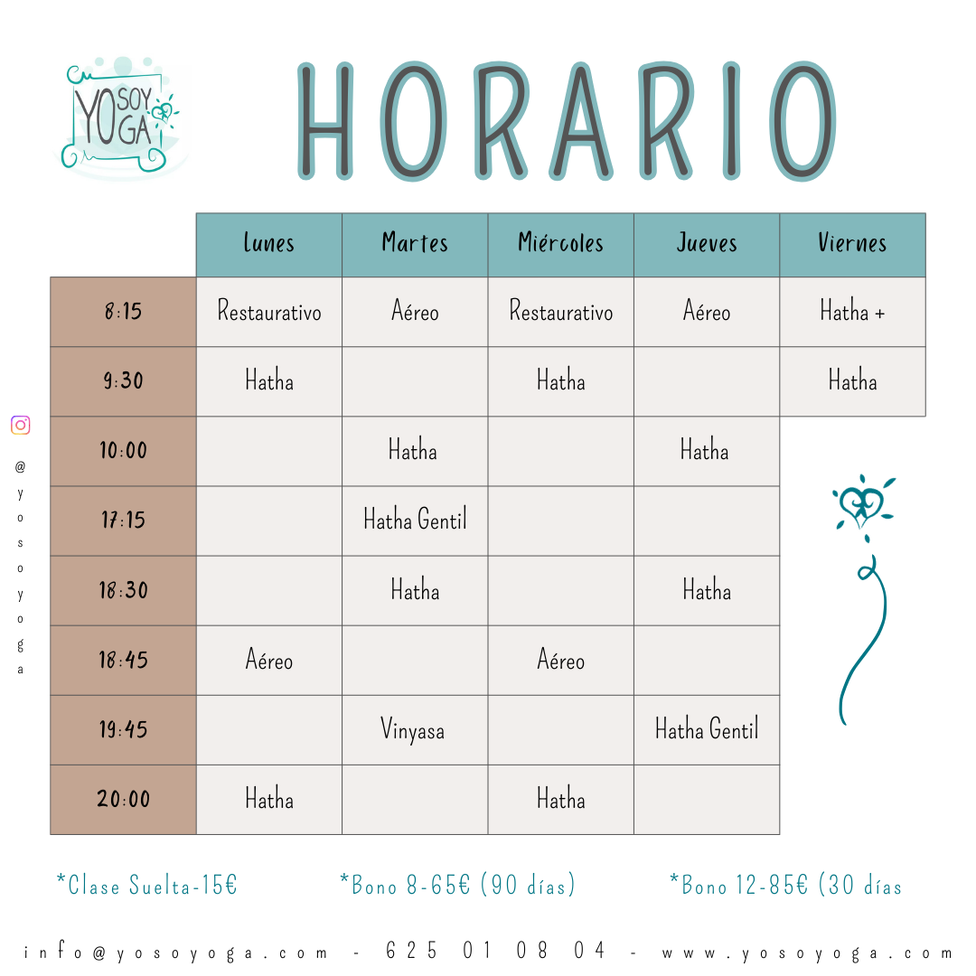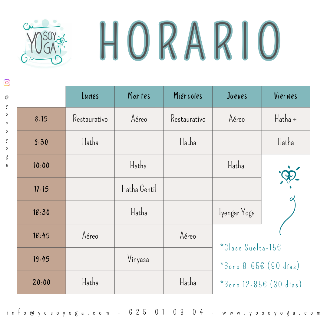 La primer clase la puedes reservar por WhatsApp (625 01 08 04) o email (info@yosoyoga.com). Al terminar la clase, decides si quieres abonar la clase suelta (15€) o si prefieres comprar un Bono. En ese caso, descontaremos la 1º clase directamente de él y empezará a correr el tiempo desde ese día.